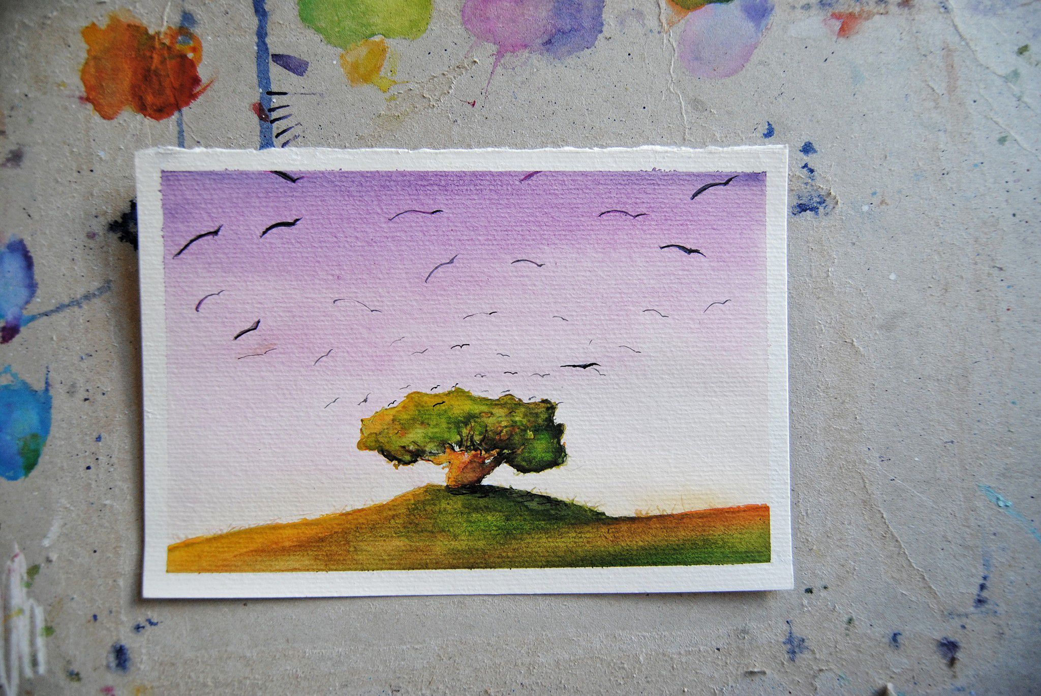 Soft Color Landscape Watercolor Illustration Tree And Birds Sketch